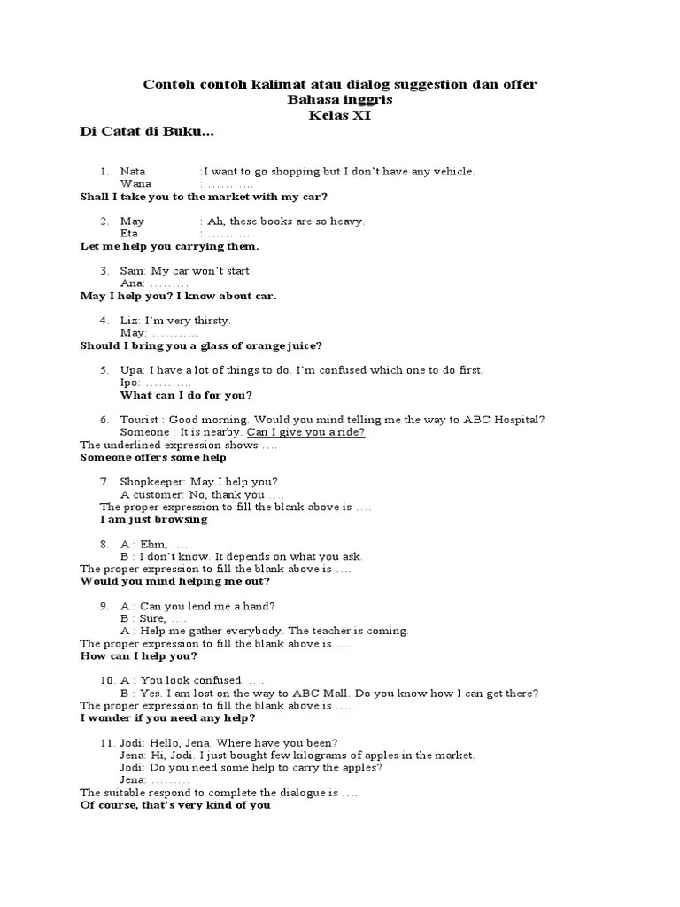 Karena hanya sekedar nasehat atau saran, tentu sifatnya. When we're making suggestions in english, we have an open dialogue. Get up and have some exercise outside" Complete the following dialogue using the expressions of obligation and not obligation. Well students, here are some expression to ask for, give, and respond the suggestion. How about seeing a movie? Kali ini dbi akan share paket soal untuk melengkapi materi suggestion and offer yang sebelumnya sudah pernah diposting. I want to help with both. Ok sahabat, kali ini saya akan sajikan kepada kamu beberapa contoh penggunaan kalimat dalam sebuah dialog offering help and services. It is also to appreciate other people, but overuse of compliments might seem insincere. Improve your english speaking skills by mimicking native speakers. Nurhilma siti ika rania a. expression of offering help atau ungkapan menawarkan bantuan untuk membawakan sesuatu dibawah ini adalah contoh ungkapan penawaran bantuan kepada seseorang yang umumnya akan ada jawaban juga dari penerima penawaran apakah akan menerima atau menolak tawaran.berikut ini percakapan bahasa inggris 4 orang yang menggambarkan dialog mengenai expression of offering to bring something.